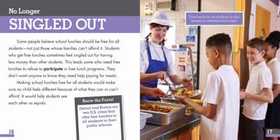 School lunches should be free for all students. Some people might strongly agree with this statement, while others might strongly disagree. In order to engage in a debate about this topic that affects readers? everyday lives, readers first need to understand both sides. They are able to do this with the help of balanced main text, fact boxes, and graphic organizers. Different points of view are clearly presented to readers, who are encouraged to think critically about an issue that would impact them and their families. This valuable reading experience is enhanced through the use of colorful photographs.