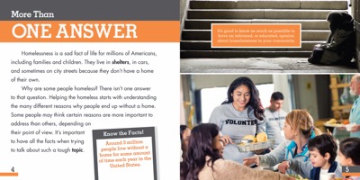 Homelessness is a problem that affects millions of people around the world. When discussing important issues such as homelessness, it is important to understand the pertinent facts in order to form a solid argument. Readers are presented with those pertinent facts through enlightening main text and helpful text features, including fact boxes and graphic organizers. Full-color photographs accompany this vital information. People approach social issues such as homelessness from different points of view, and readers are introduced to new perspectives as they enhance their own critical thinking skills.